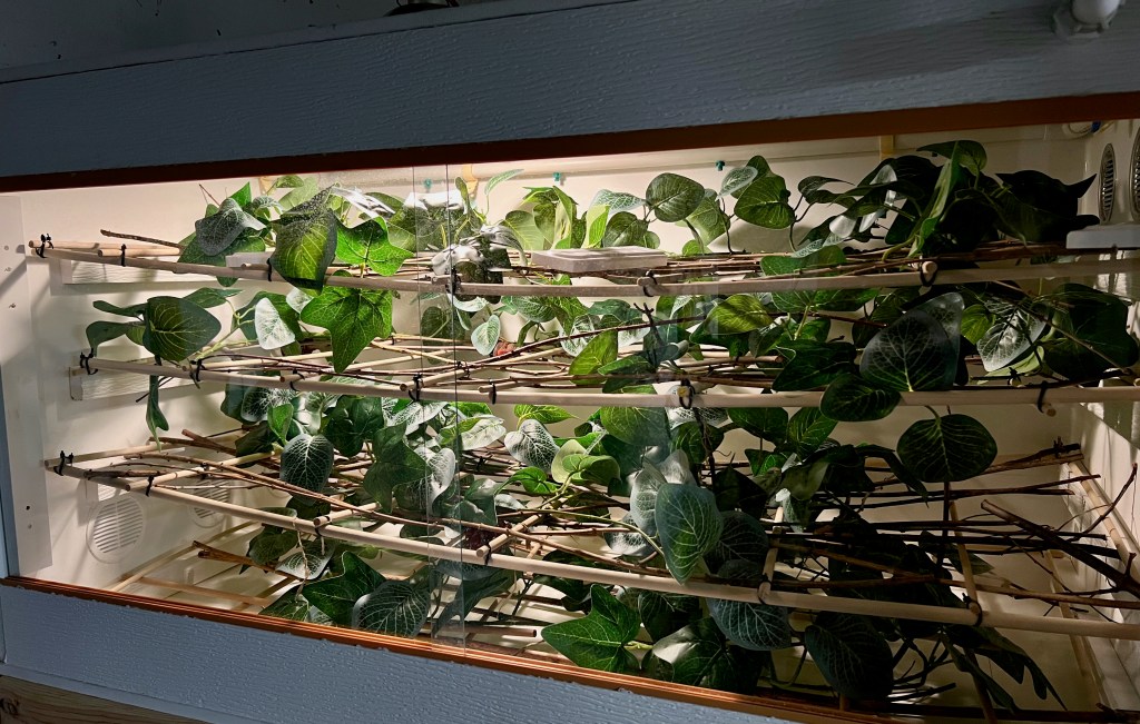 The cage is well ventilated and so have big temp gradients for the snakes to choose from. Temps in the cage range from the mid 90s under the halogen lamps and the DHP (deep heat projector) to the low 70s at the far corners away from the lamps. The babies thermo-regulate depending on their shed cycle, food intake, etc.